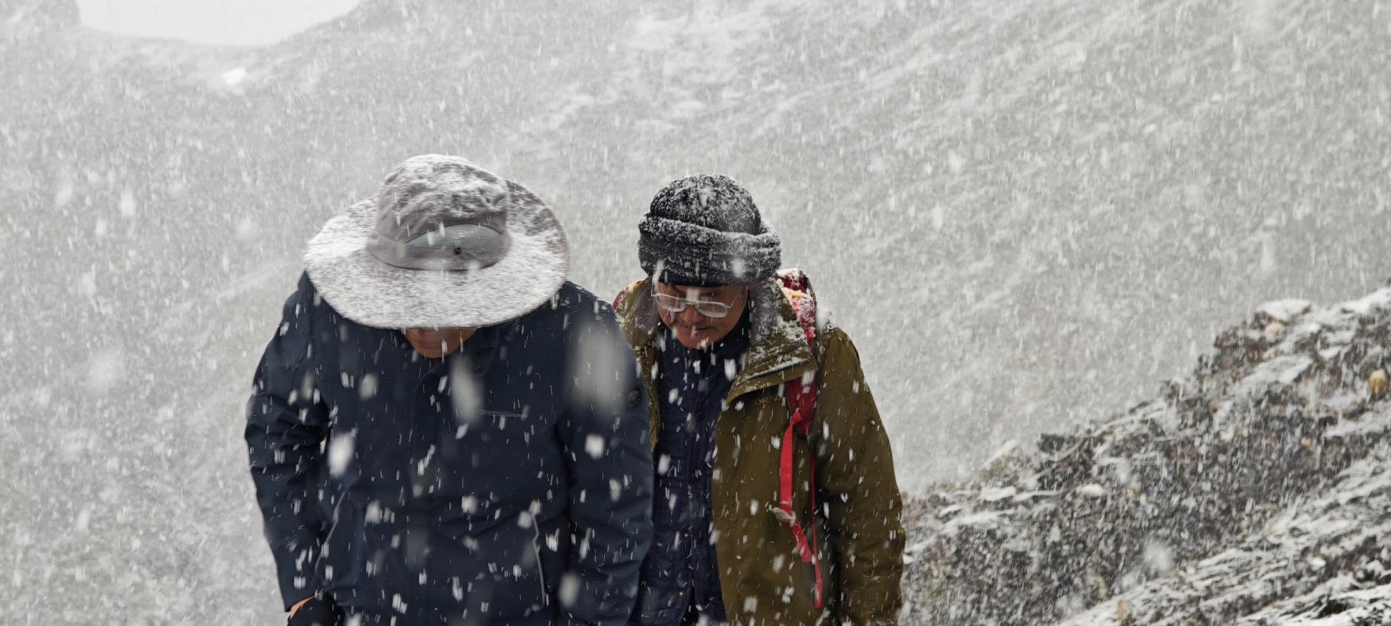 风雪是自然最凌厉的笔触,把地质人塑成移动的“雪人”。浓雾弥漫处,岩石的棱角在能见度不足五米的混沌里随时成了可能倾覆的陷阱。那顶被积雪压弯的宽檐帽,在雪粒中仍紧盯着岩石的眼镜,雪窝里深深浅浅不一的足印——每一步都是对“艰辛”专业和意志的考验。在海拔3600米的碎石坡上,地质锤的敲击声被狂风撕碎,却从未停下节奏;在零下十几度的严寒里,冻僵的手指仍牢牢攥着罗盘,只为勾勒出地层最真实的褶皱。