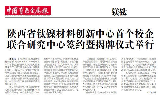 校企联合研究中心由钛镍创新中心依托建设单位西安宝钛新材料科技有限公司牵头,联合上海交通大学材料科学与工程学院、南通博峰私募基金管理有限公司共同组建,旨在依托上海交通大学顶尖的科研实力,以及在钛、镁等材料研究方面的先进成果,借助南通博峰私募基金管理有限公司丰富的资本运作、产业孵化及战略咨询经验,融合宝钛集团完备的产业链群,以及在工程化应用、产业化推广方面的优势,建成国内领先、国际知名的高能级“产学研金”平台,在实现关键技术突破、加快科技成果转化、推进产业转型升级、引进培养高层次人才等方面发挥更大作用。