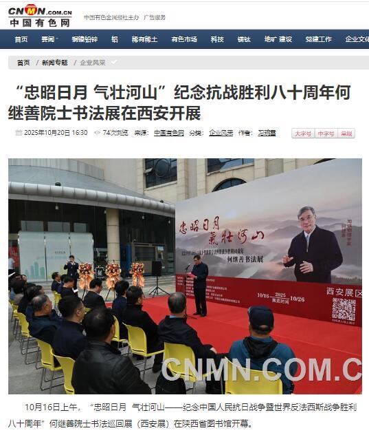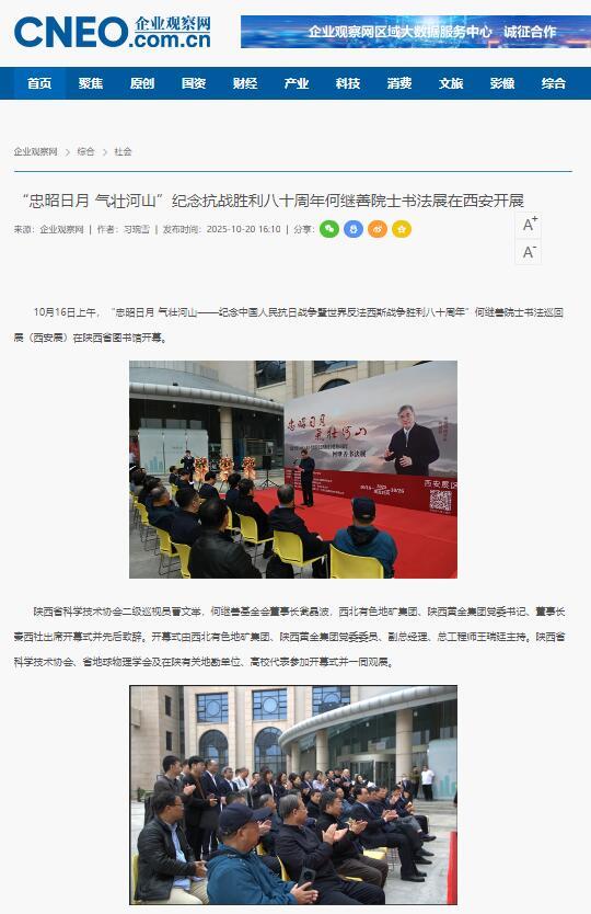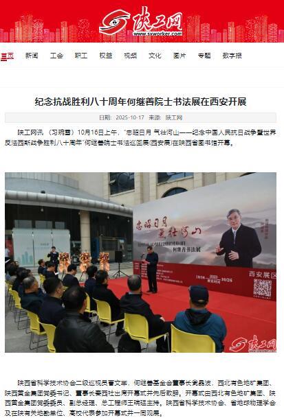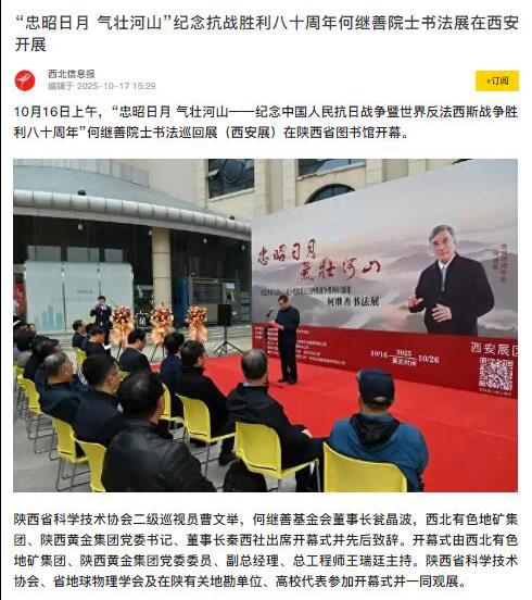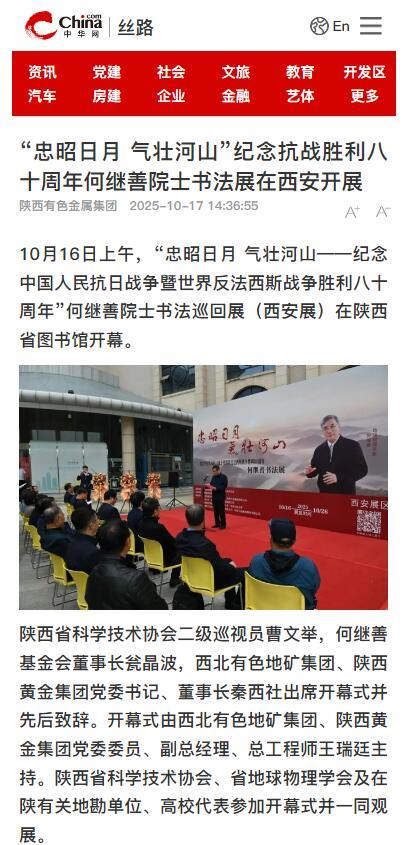 10月16日上午,为纪念中国人民抗日战争暨世界反法西斯战争胜利八十周年,“忠昭日月 气壮河山——何继善院士书法展”在陕西省图书馆开幕,地矿集团、黄金集团进行集中报道,活动引发社会广泛关注与热烈反响。据不完全统计,截至目前,活动已被中华网、陕西一套、消费日报、中国有色网、起点XK在线平台、丝路建设、西北信息报、陕工网、企业观察网、搜狐、网易XK在线平台、今日头条等媒体转载与刊播,形成了多维度、立体化的传播声势。