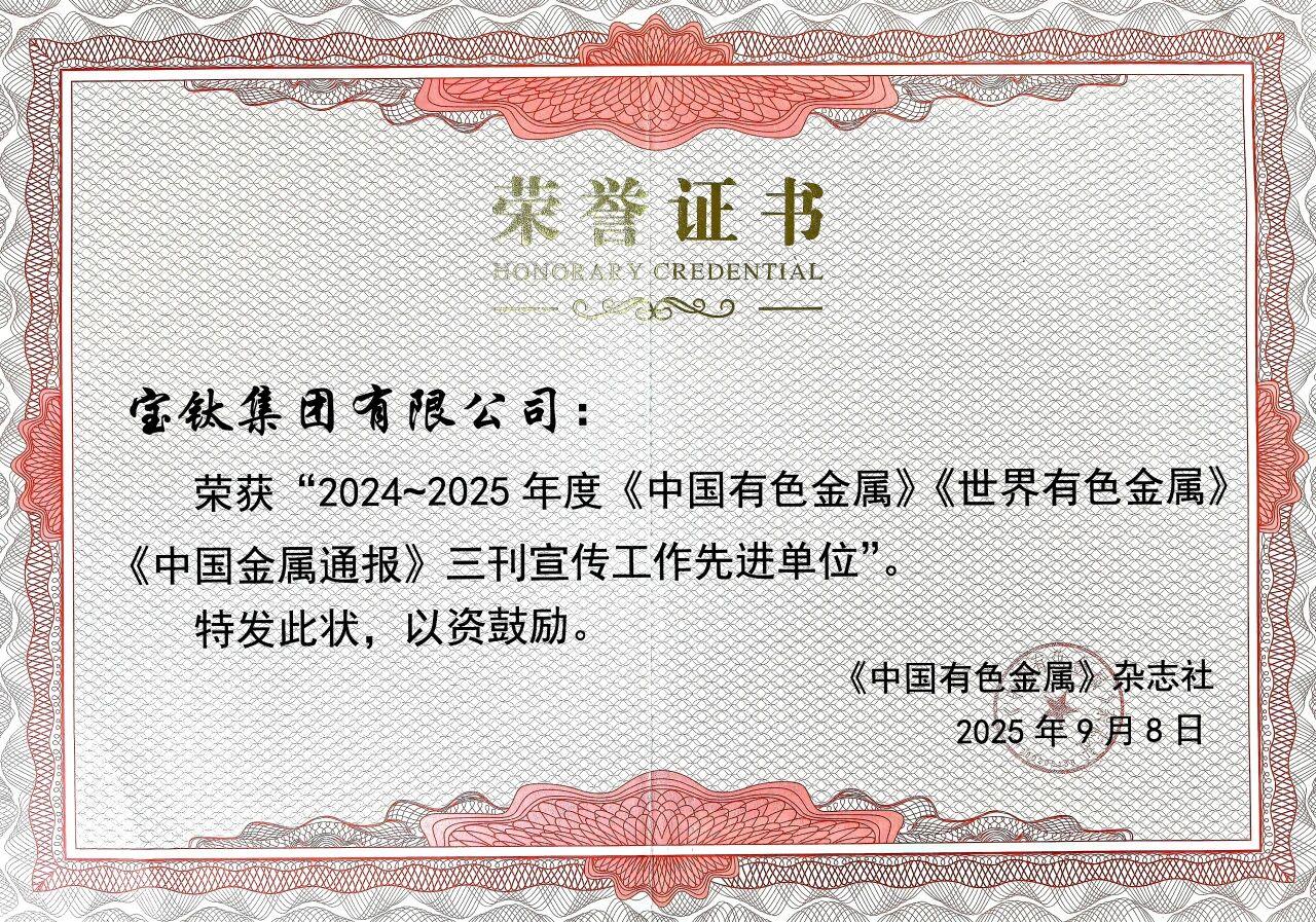 在9月18日至19日召开的第26届《中国有色金属》《世界有色金属》《中国金属通报》三刊特约通讯员暨《中国有色金属工业年鉴》撰稿人工作会议上,宝钛集团荣获2024——2025年度“三刊”宣传工作先进单位称号。