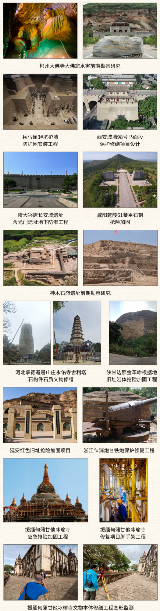 工程公司秉持“文物+岩土”特色发展路径,以“保护为主、抢救第一,合理利用、加强管理”为遵循,累计承接300余项文物保护工程,一批重点项目获得政府主管部门与行业资深专家高度认可。从秦始皇陵兵马俑坑壁加固、西安城墙修缮、含光门水害治理等承载城市记忆的核心项目,到彬州大佛寺前期勘察研究、石峁遗址抢险、乾陵环境整治、承德古塔保护加固等重要遗存保护,每一项工程都凝聚着专业匠心。同时,公司深耕近现代革命史迹保护,延安红色旧址、陕甘边照金革命根据地旧址、浙江乍浦炮台等项目的实施,让红色文化基因得以代代相传。